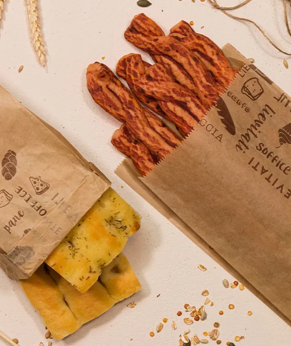 • die fettdichten Beutel für Spezialbrote, Focaccia, Pizza am Stück und andere gewürzte Brotprodukte wie Taralli (Knabbergebäck-Snacks aus dem Süden Italiens), Brotstangen usw.