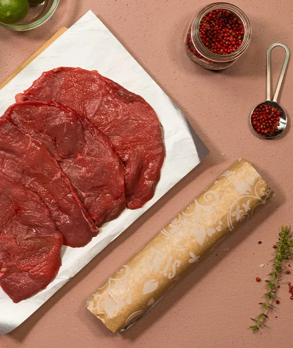 Blanca ist eine PFAS-freie Einzelstoff-Papier-Verpackung, die für den direkten Lebensmittelkontakt geeignet ist. Sie ist ideal zum Verpacken von Fleisch.
